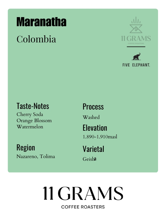 Maranatha coffee, sourced from Nazareno, Tolima, Colombia, is a Geisha variety grown at elevations of 1,890–1,910 masl. Washed to preserve clarity, this coffee offers a refined cup with complex notes of cherry soda, orange blossom, and watermelon, making it an exceptional and rare coffee for true connoisseurs.