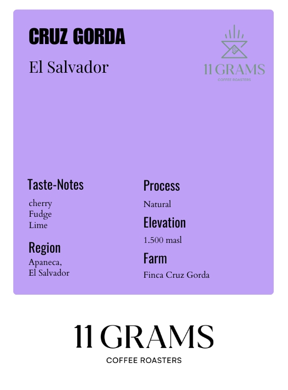 Sourced from the renowned Finca Cruz Gorda in the Apaneca region of El Salvador, this coffee is cultivated at 1,500 masl. With its natural processing, Cruz Gorda coffee presents a vibrant flavor profile, beginning with rich cherry notes, followed by creamy fudge, and finishing with a zesty lime kick that brightens the cup.