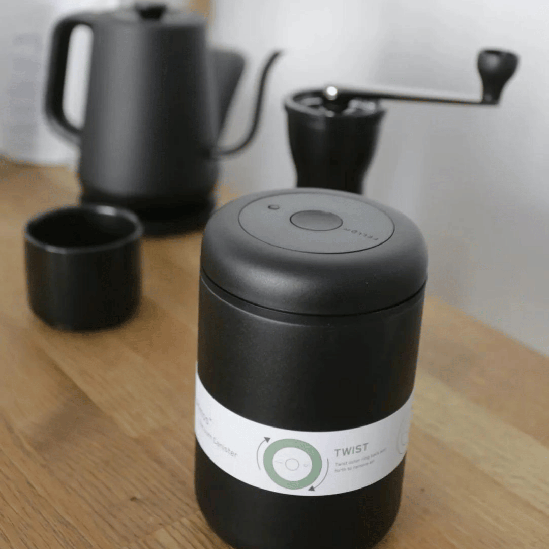 The lid sucks the air out of the container to prevent oxidation and protects your coffee from moisture, odours and ageing. You can open the canister by simply pushing the release button on top of the lid, and once you’re done, twist the lid back on.